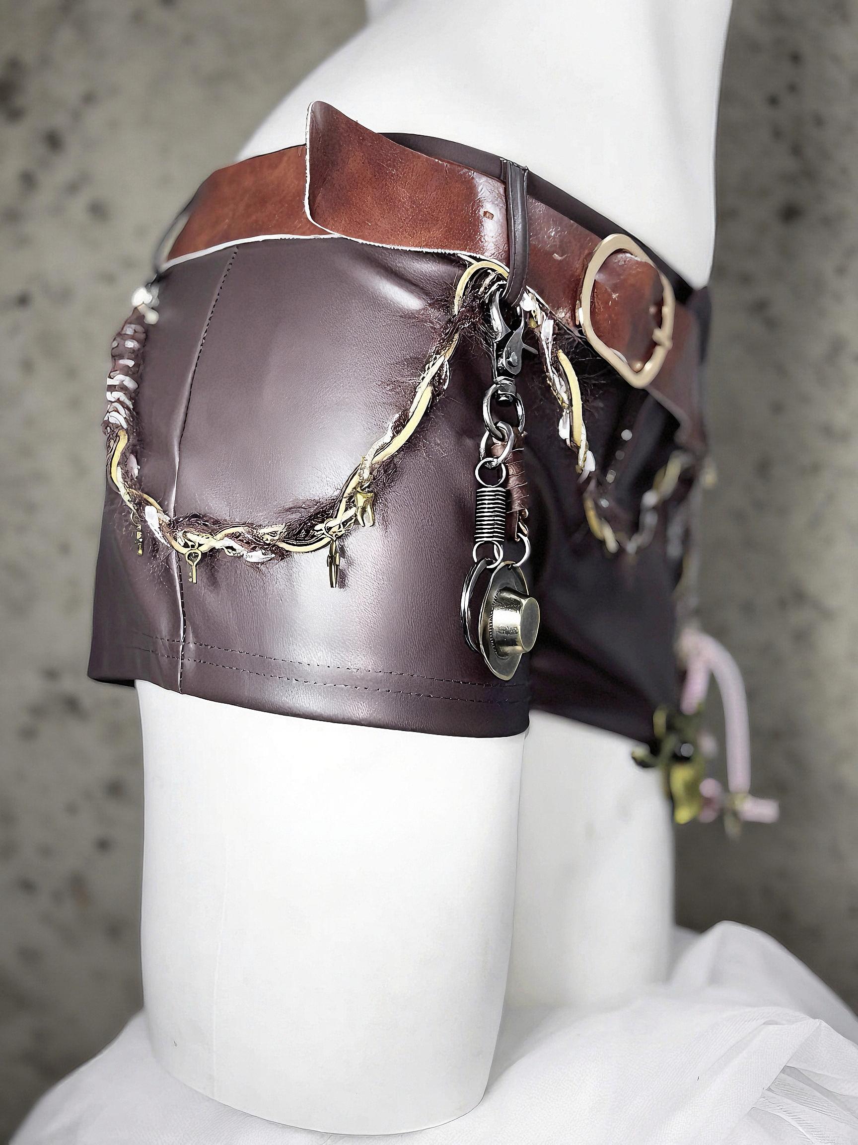 The corset top is crafted from textured jacquard fabric with a lock zipper and resin wolf tooth charms. The PU leather shorts feature layered gothic accessories: metal bull head, thorned chain with crosses, keys and locks, and miniature props such as a rope, cactus, hat, and flask — all evoking the treasures of a pirate explorer. A detachable long pendant necklace completes the look.
