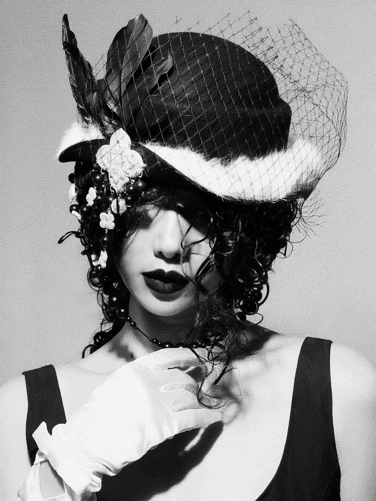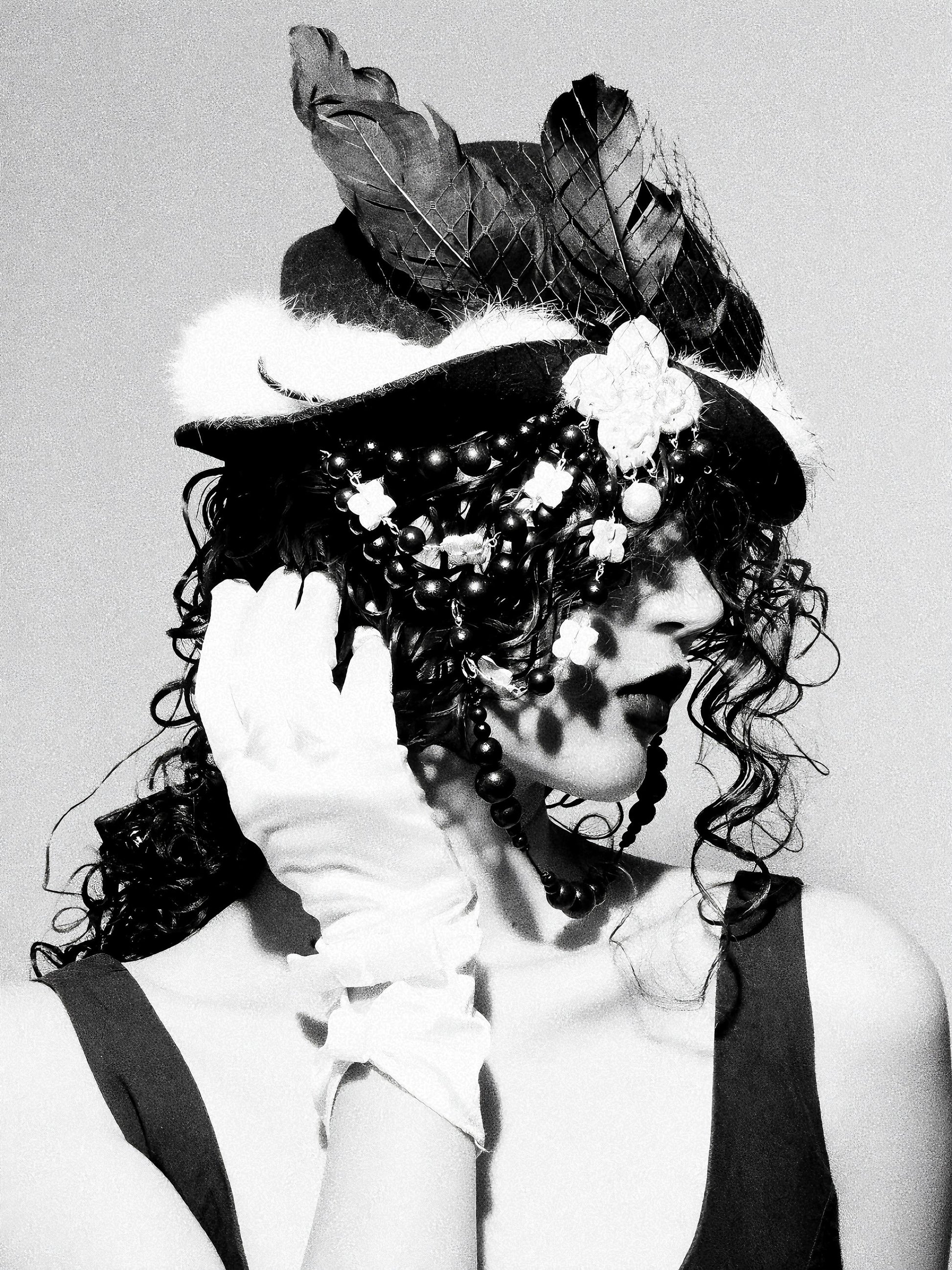 A sculpted arrangement of feathers, a hand-crafted ceramic flower, and a flowing black-and-white beaded drape create a striking focal point. The convertible mesh veil can be styled upward or downward, allowing you to effortlessly switch between two unique looks—mysterious, soft, or intensely dramatic.