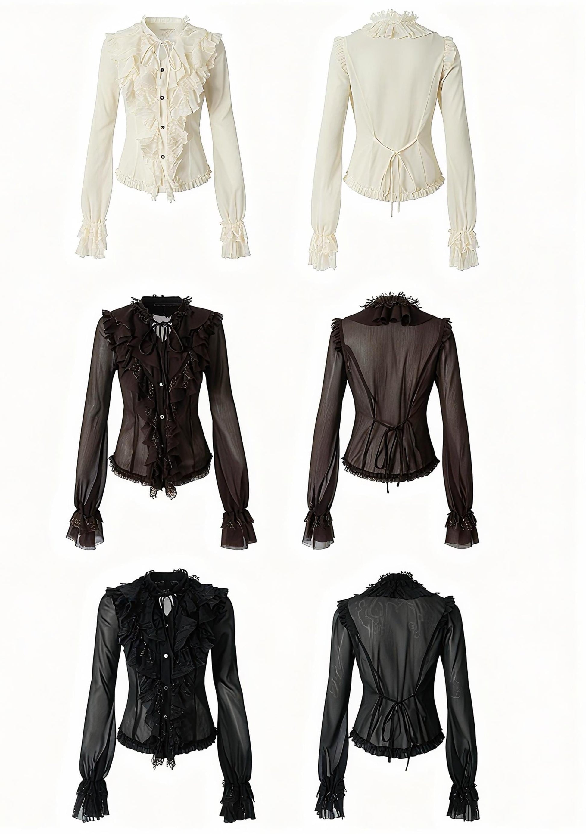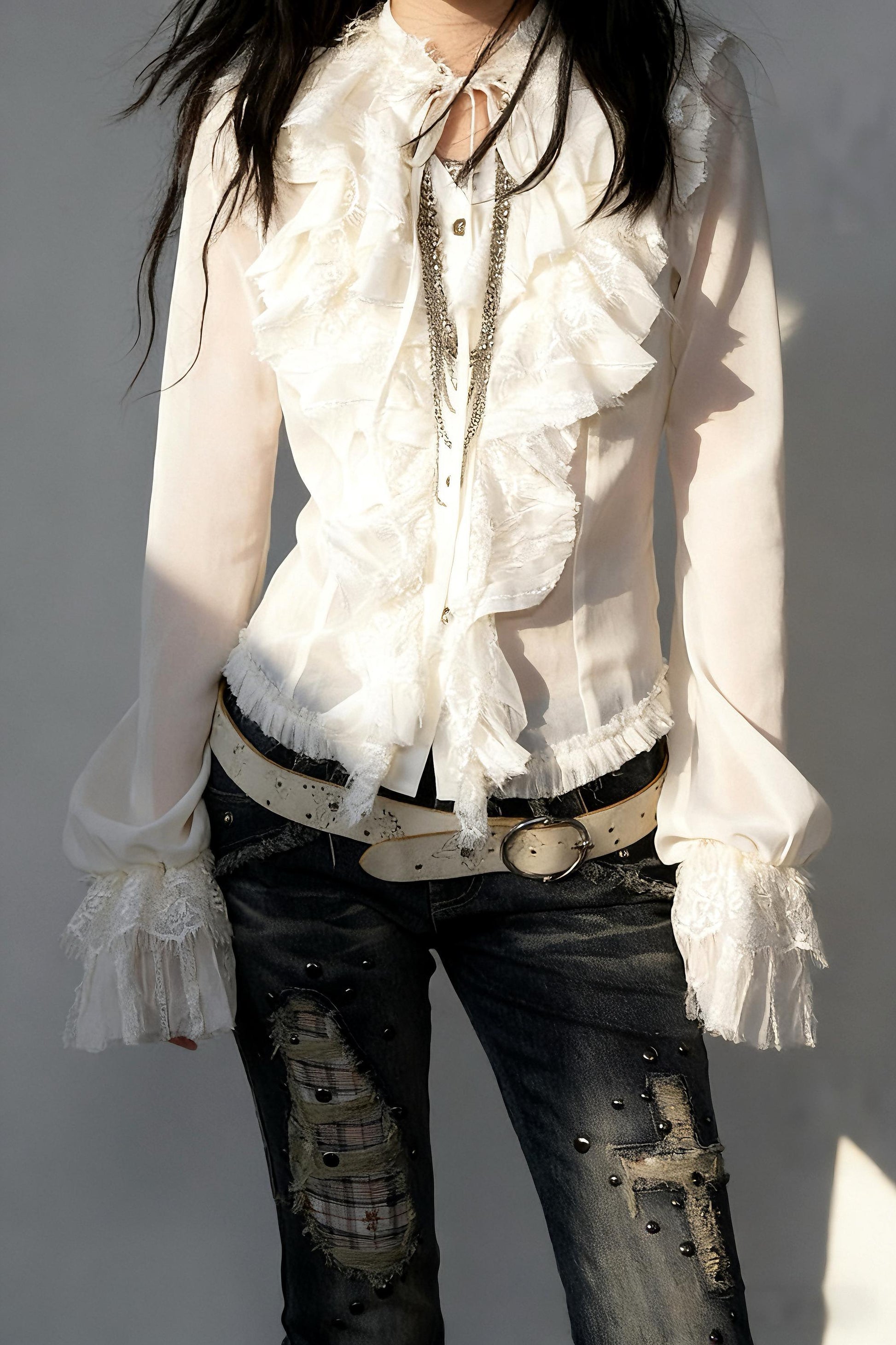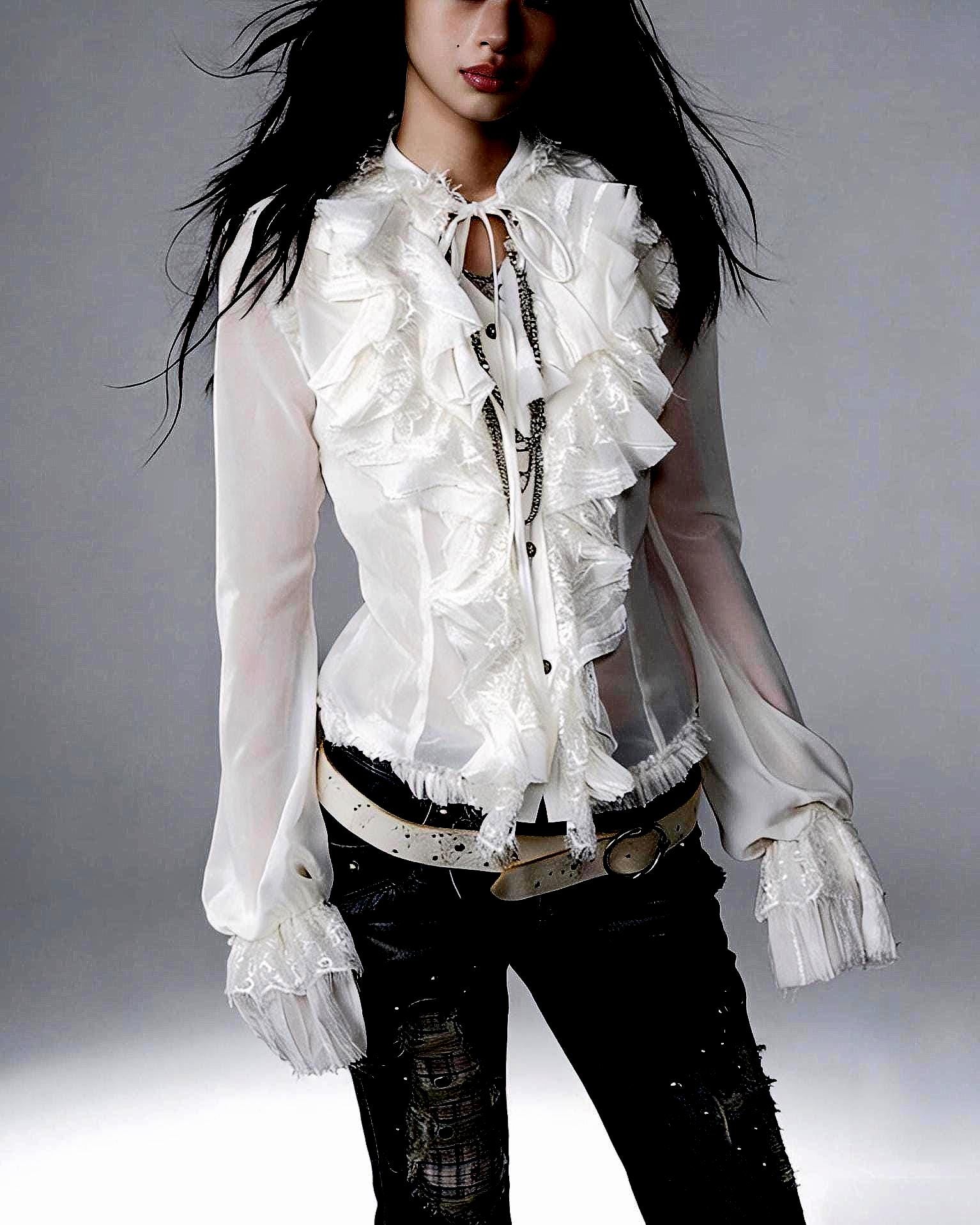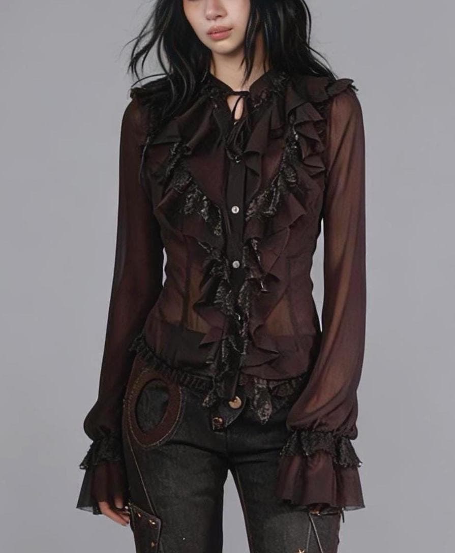 Crafted from lightweight, semi-sheer chiffon, the fabric feels airy and fluid against the skin, delicate yet expressive, like a dream that appears fragile but remains beautifully pure. The ruffled lace trims and layered construction create movement and depth, enhancing the blouse’s poetic, romantic character.