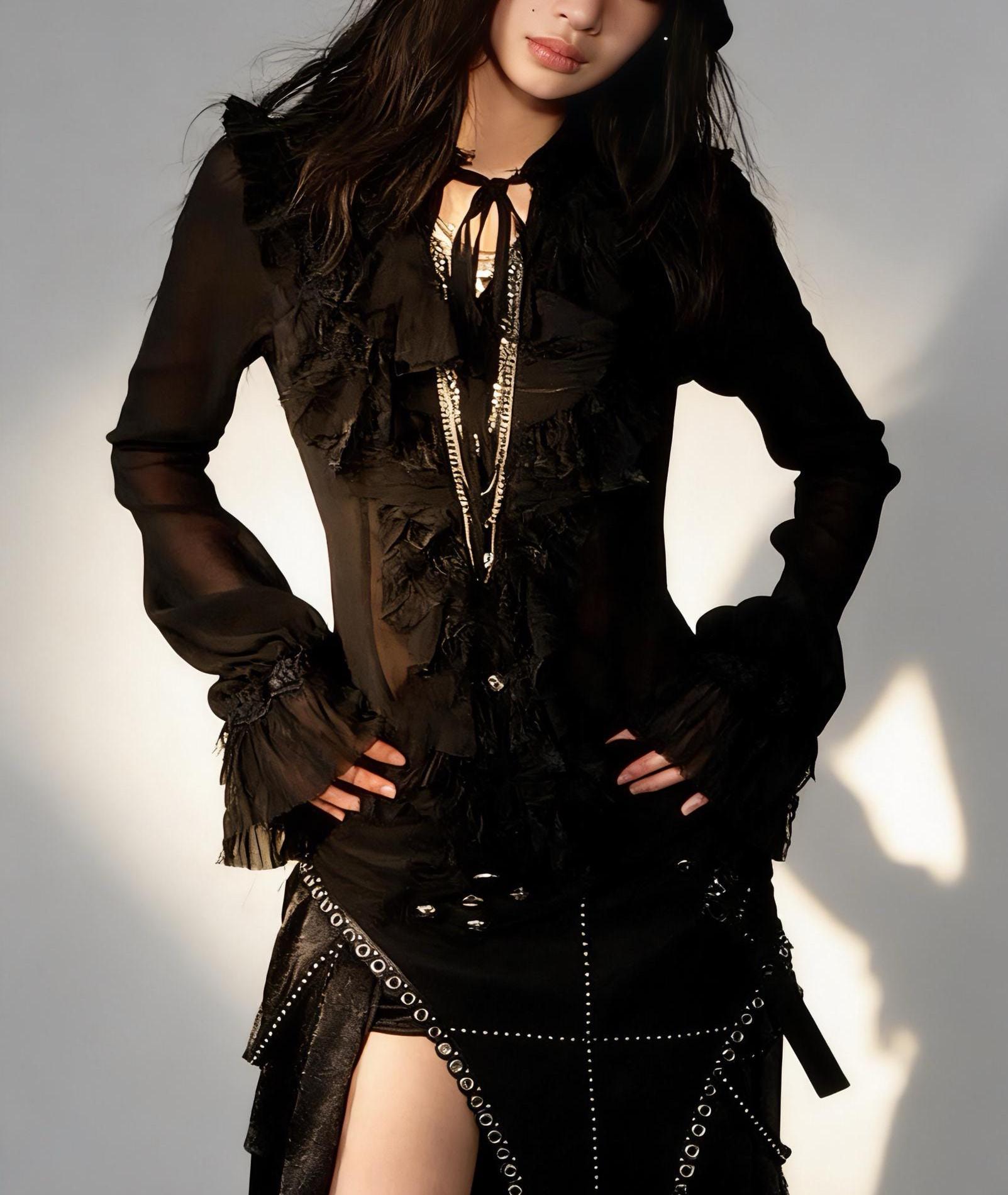 Victorian Gothic Chiffon Blouse with Ruffles, High Neck Lace Shirt, Sheer Romantic Palace Style Top, Dark Elegance Gift for Her